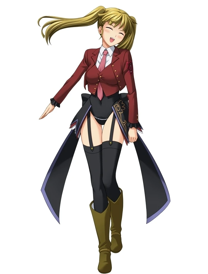 She has long, brassy hair in two straight ponytails, a fair skin and big red eyes. Her clothes are the same as those of the other Stakes. She wears the one-winged eagle on her "skirt".
