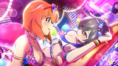 This card depicts Kazuho Kimiyoshi in a swimsuit. The 6-star artwork features Rena Ryuugu in her own Night Pool outfit.