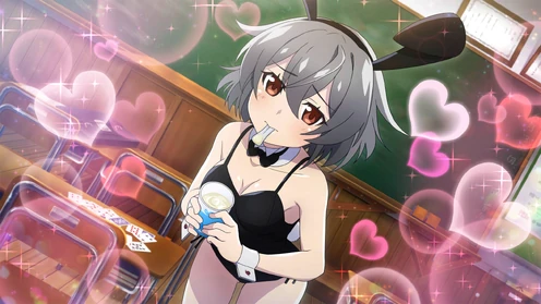 This card depicts Kazuho Kimiyoshi in a bunny girl punishment outfit. The 6-star artwork features Keiichi Maebara in a similar outfit. Her Active Skill "Bunny's Wonderful Wand" is Japanese wordplay: "Wonderful" (ステキ suteki) sounds similar to "Wand" (ステッキ sutekki), or "stick".