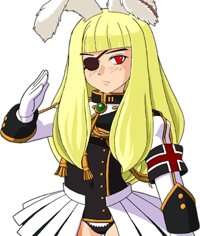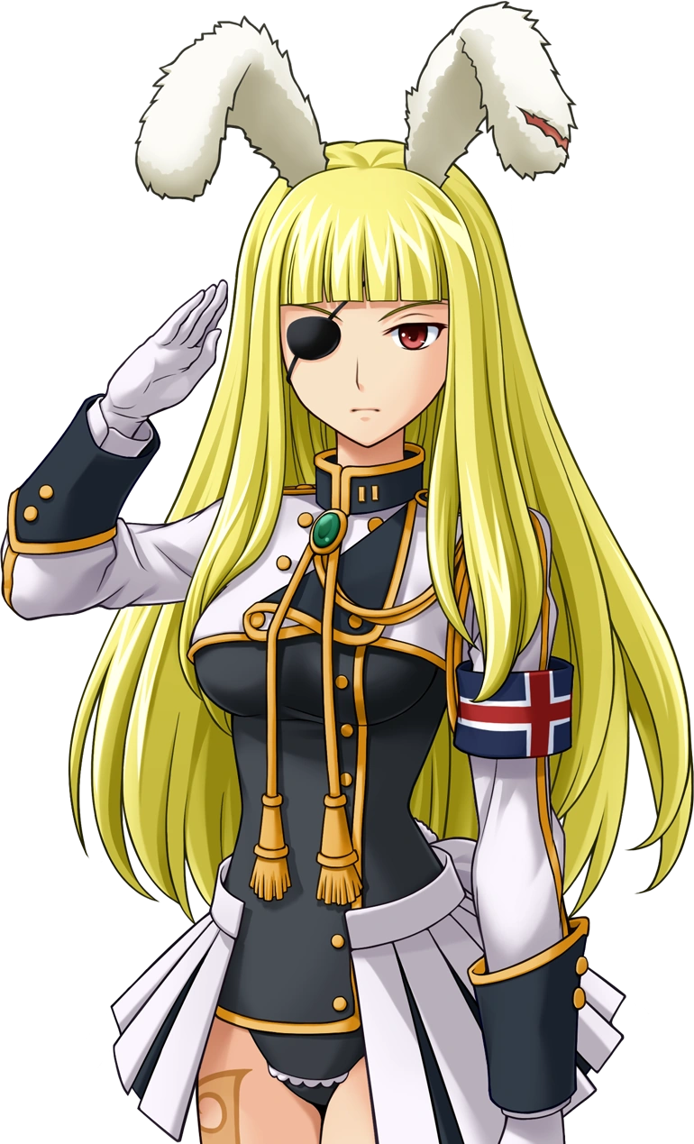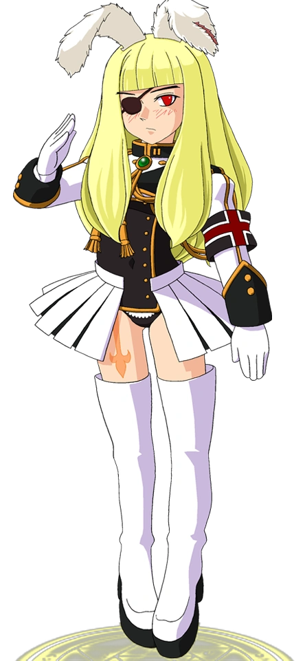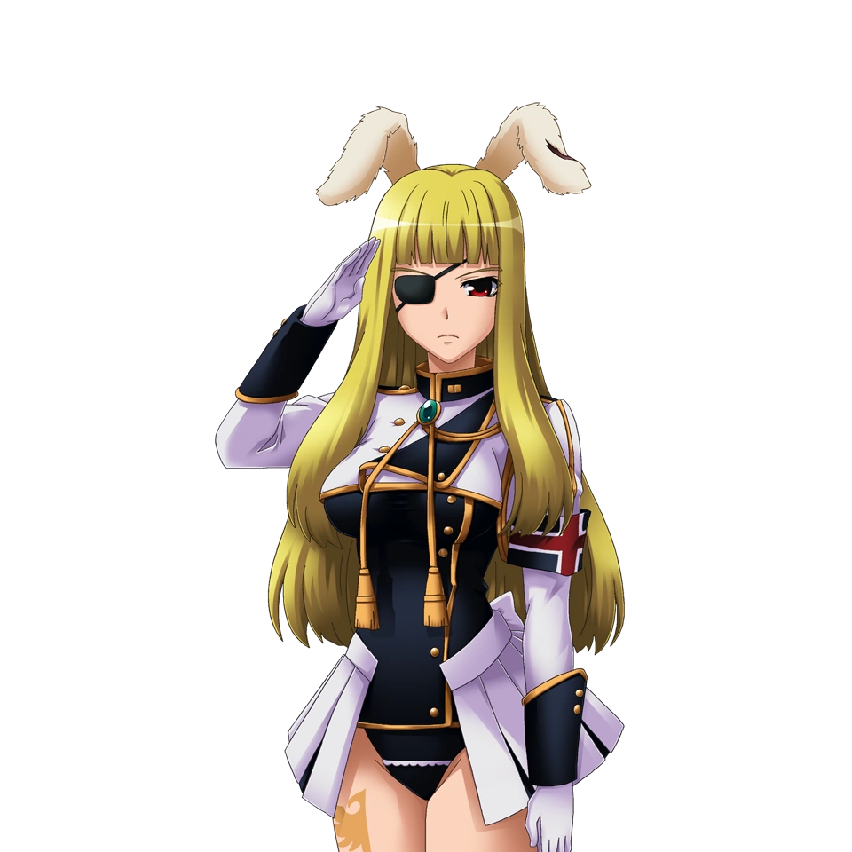 Chiester 00 wears a black uniform and has long blonde hair. She has an eyepatch over her right eye and a scar on her left bunny ear.