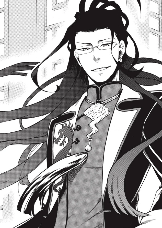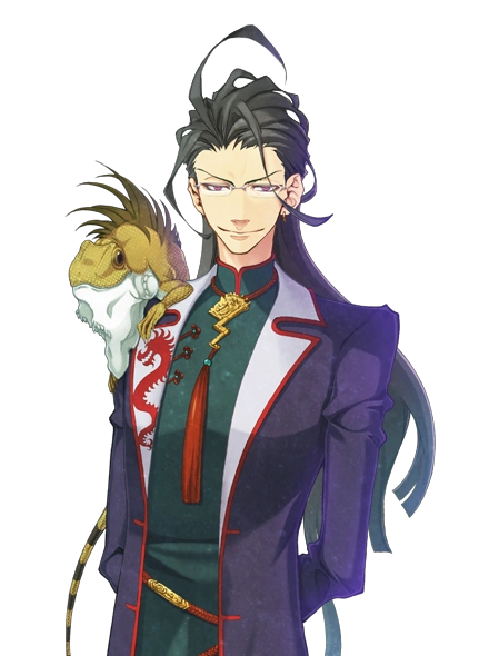 Meijiu has long black hair and glasses. He wears a purple coat with a red dragon on the lapel. His pet iguana Huahua is always seen on his shoulder.