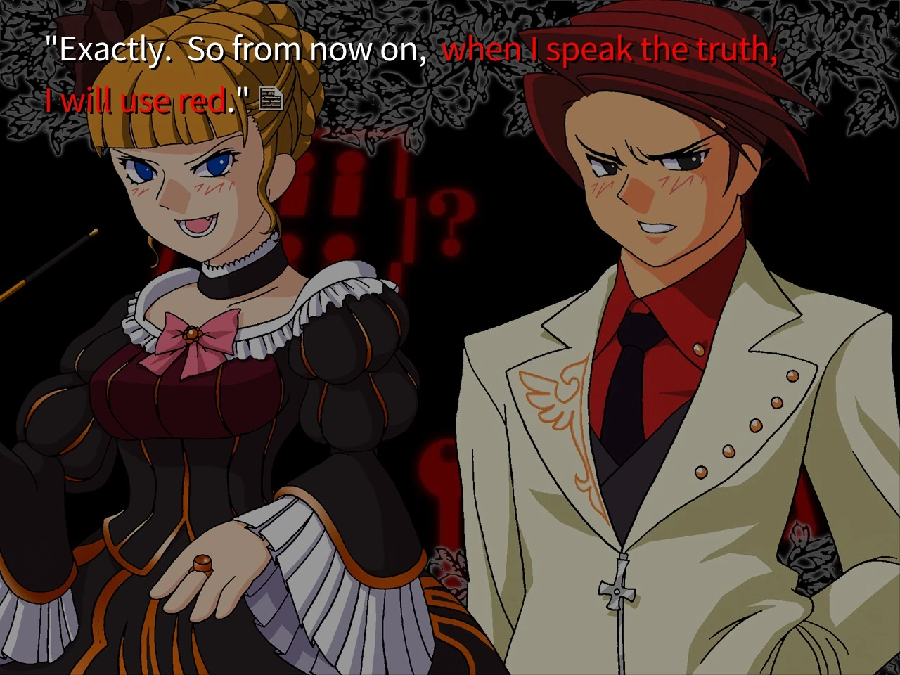 The Red Truth in the original visual novel is presented with red text and a sound effect. The nature of how the Red Truth is distinguished from other words by the characters (aside from the reader for obvious reasons) is unknown.