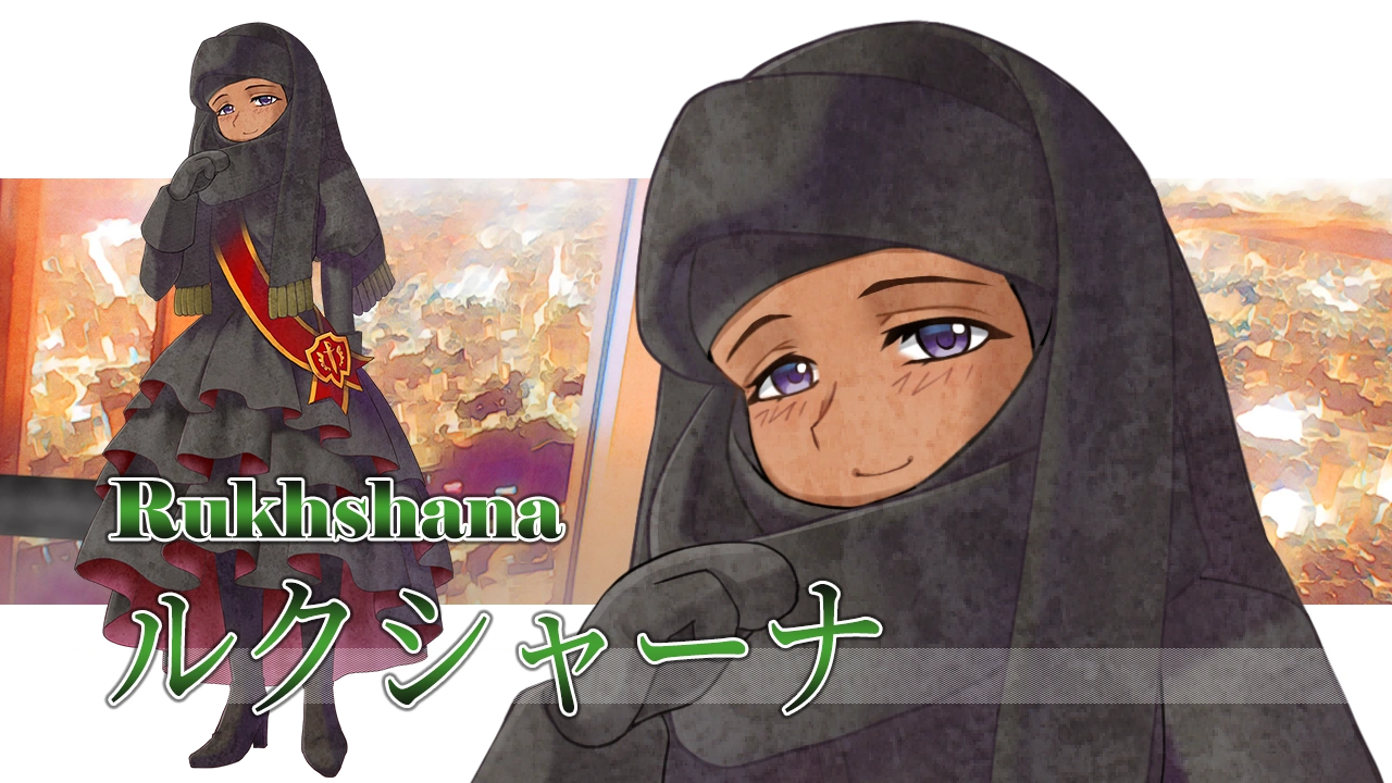 Rukhshana was born and raised in COU Saudi Arabia, which had a culture finding it immoral for men and women to share the same workplace. When Rukhshana became a Gauntlet Knight, there was much outcry after it became known that she was to be placed in Suparna with a man, Andry. Rukhshana was allowed to stay in the squad after intervention from the COU government.