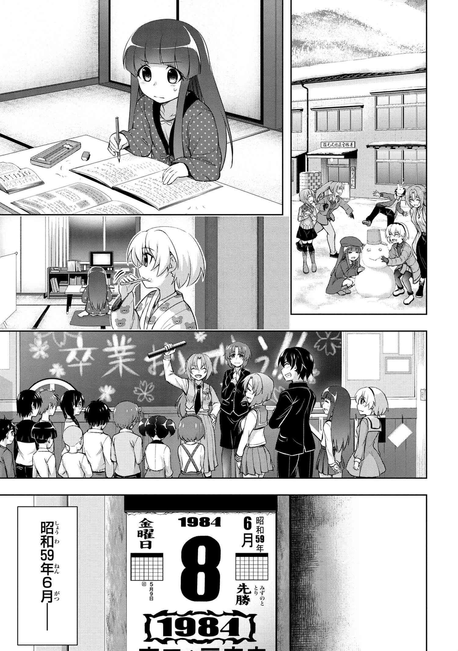 Time passes. Winter comes to Hinamizawa, Rika begins her studies, and Mion graduates from the school. In June of 1984, Satoko complains about Keiichi using a new deck of cards during a club game, as there are no scratches on them. Keiichi says they've introduced a new club rule preventing cheating, as they have younger kids playing now. Rika bows out of the activities and says she needs to go home early. Rena and Keiichi comment on Rika spending so much time studying and offer to help if she needs it. They look forward for the next chance to play club games with her. Rika bids farewell and Satoko watches her go. She thinks playing club with the rest of the class is fine, but playing without Rika and Mion is lonely.