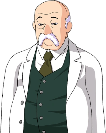 Nanjo is old and balding with white hair and a white mustache. He wears a white coat over a green vest and green tie with black shoes.